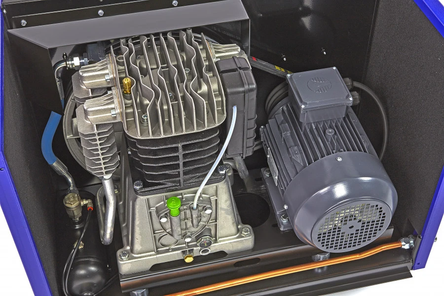 De robuuste Michelin MCX 958 N luchtcompressor is een hele stille compressor, Het geluidsniveau van 66 decibel (op vier meter afstand) komt ongeveer overeen met dat van een gemiddeld kantoor. De 7,5 pk sterke elektromotor zorgt voor de riemaandrijving van deze tweetrapscompressor. De twee cilinders persen de lucht samen tot een werkdruk van 10 Bar. De vier stelvoeten maken dat de compressor ook op een licht oneven ondergrond geplaatst kan worden. Aan de voorzijde bevindt zich de aan/uit-knop en de manometer.