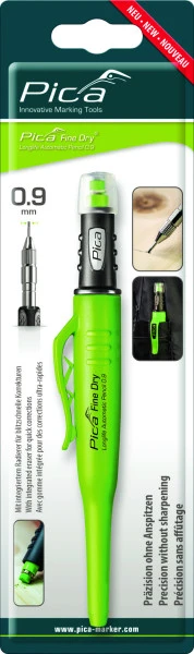 De Pica Fine Dry met speciale puntdiameter van slechts 0,9 mm is perfect voor fijne en exacte markeringen zonder te slijpen. De grote geΓ―ntegreerde gum maakt snelle correcties mogelijk. Standaard inbegrepen zijn 5 grafietstiften in HB.