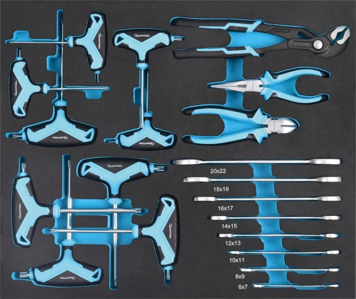 De Quantool gereedschapwagen 217 delig is de oplossing voor het organiseren van al je gereedschap. Deze gevulde gereedschapswagen bevat maar liefst 7 lades die afsluitbaar zijn om ervoor te zorgen dat jouw gereedschap veilig opgeborgen is. Daarnaast beschikt deze wagen over 4 foam inlays met diverse gereedschappen en 3 lades die vrij indeelbaar zijn. De bokwielen van deze gereedschapwagen zijn geremd, waardoor de wagen op zijn plaats blijft staan. Bovenop de gereedschapwagen bevindt zich een werkblad met een rubber profielmat en een opstaande rand zodat jouw gereedschap niet wegrolt. Aan de beide zijden van de wagen kun je nog meer gereedschap ophangen.